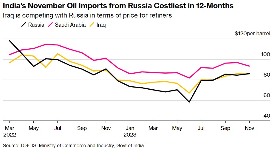 印度政府数据显示,去年11月份印度从俄罗斯进口的原油价格为一年来最高,反映出油价折扣减少。印度炼油商从俄罗斯购买原油的平均价格为每桶85.90美元,较去年10月份的84.46美元上涨1.8%。印度是全球第三大石油消费国,俄罗斯是其最大的石油供应国。
