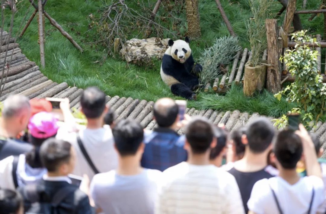 2018年4月,贵阳,游客在大熊猫馆内观看大熊猫“海浜”。视觉中国/图