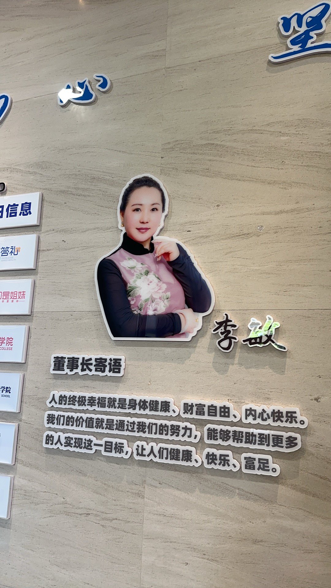 日赢控股办公楼一楼的宣传墙显示李敏为公司董事长