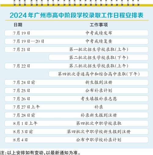 广州市招考办发布《2024年广州市高中阶段学校录取工作日程安排表》。根据《安排表》,7月19日,广州中考成绩发布。
